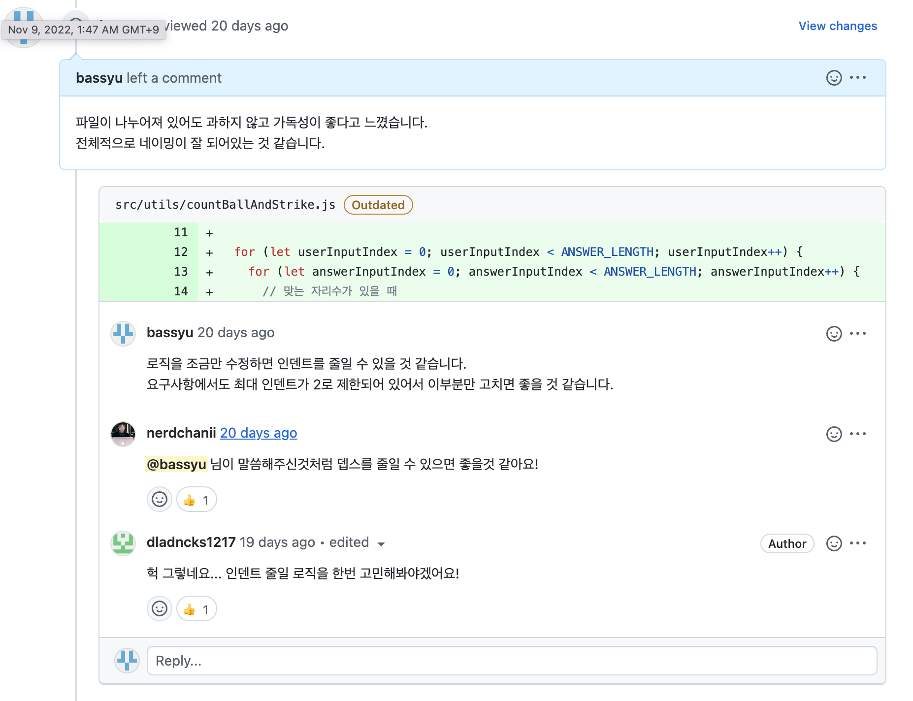 또한 풀리퀘스트를 하면 깃헙에서 직접 리뷰를 진행할 수 있는데, 이 리뷰기능을 활용해서 서로의 코드를 리뷰하며 학습을 할 수 있습니다. 저 또한 과제마다 리뷰를 진행했고 다음 과제에서도 큰 도움이 되었습니다.