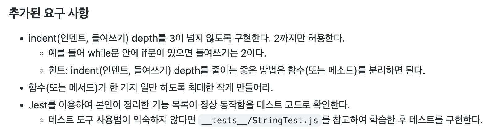 이처럼 기능과는 관련 없지만 들여 쓰기, 함수의 길이, 테스트 등 코드의 품질을 높이는 요구사항이 있고, 이는 매주 발전합니다.